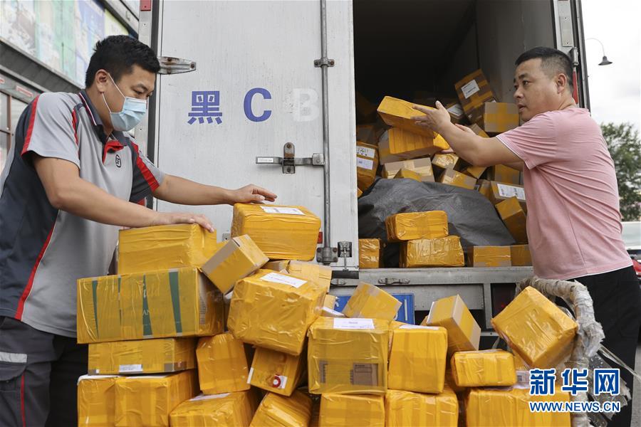 9月9日,快递员在位于中国(黑龙江)自由贸易试验区绥芬河片区的伊戈尔大市场外接收准备发往各地的俄罗斯货品。 新华社发(张涛摄)