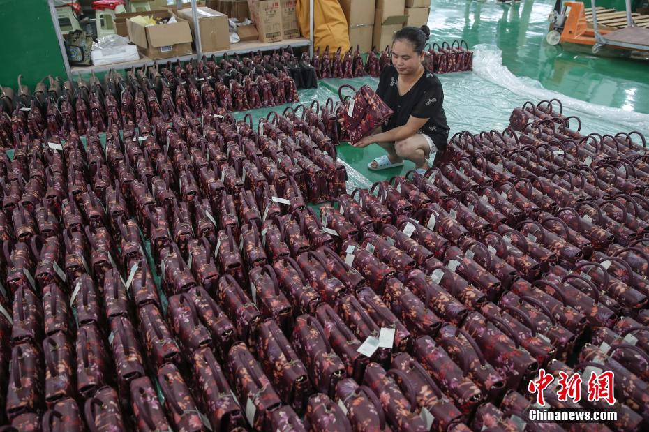 9月9日,一位工人在检查即将包装的皮包。当日,在贵州省黔西南布依族苗族自治州望谟县的易地扶贫搬迁安置点平郎社区一家皮具手袋扶贫工厂里,工人正赶制各类皮包供应海外市场。中新社记者 瞿宏伦 摄