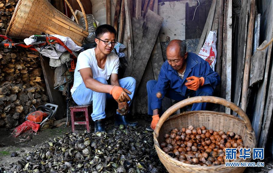 王新富(左)和岳父一起剥核桃(9月8日摄)。 新华社记者 刘潇 摄