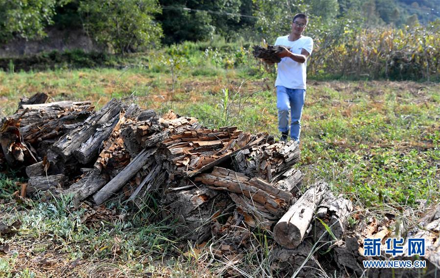 王新富将被洪水冲毁的药材菌棒清理到田边(9月8日摄)。 新华社记者 刘潇 摄