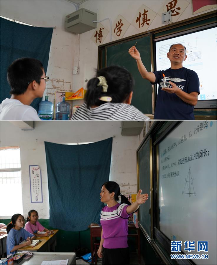 拼版图片:上图为长丰乡学校老师王景明(右)在教室上化学课(9月8日摄);下图为长丰乡学校老师邓君(右)在教室上数学课(9月8日摄)。夫妻二人于2004年结婚。 新华社记者 胡晨欢 摄