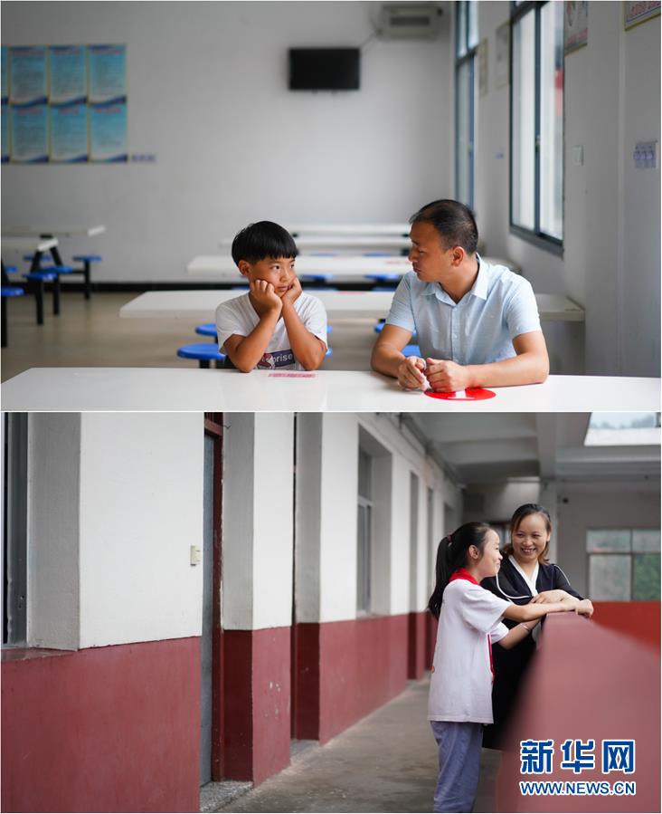 拼版图片:上图为长丰乡学校校长王鹏(右)与一名学生交谈(9月8日摄);下图为长丰乡学校老师吴季芬(右)和一名学生谈心(9月8日摄)。夫妻二人于2003年结婚。 新华社记者 胡晨欢 摄