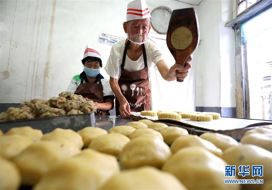 9月12日,石家庄市井陉县天长镇的“端盛长”传统手工月饼制作工坊的经营者、72岁的于银柱(右)用手工刻制的模具制作月饼。 随着中秋佳节的临近,位于河北省石家庄市井陉县天长镇的“端盛长”传统手工月饼制作工坊开始忙碌起来,工作人员开足马力制作月饼。据了解,井陉县天长镇“端盛长”传统手工月饼制作工坊起源于清代,距今已有百余年历史。“端盛长”传统手工月饼以五仁和豆沙馅为主,从和面、做馅、擀皮一直到包制、印模、烘烤,每一道工序均为手工制作完成。 新华社发(梁子栋 摄)