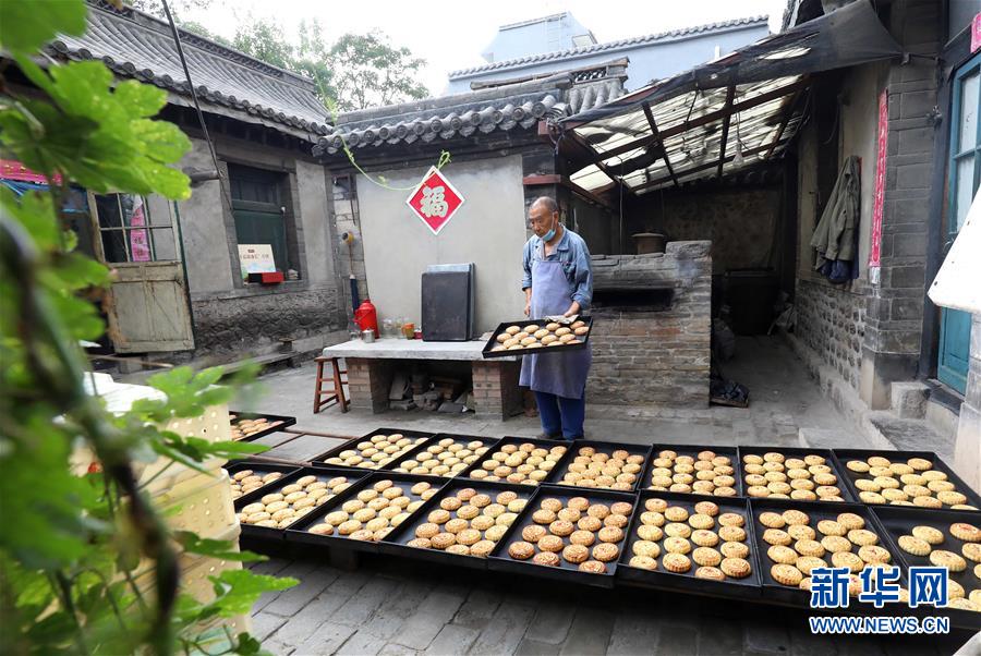 9月12日,石家庄市井陉县天长镇的“端盛长”传统手工月饼制作工坊的工作人员从土炉内取出烘烤好的月饼。 随着中秋佳节的临近,位于河北省石家庄市井陉县天长镇的“端盛长”传统手工月饼制作工坊开始忙碌起来,工作人员开足马力制作月饼。据了解,井陉县天长镇“端盛长”传统手工月饼制作工坊起源于清代,距今已有百余年历史。“端盛长”传统手工月饼以五仁和豆沙馅为主,从和面、做馅、擀皮一直到包制、印模、烘烤,每一道工序均为手工制作完成。 新华社发(梁子栋 摄)