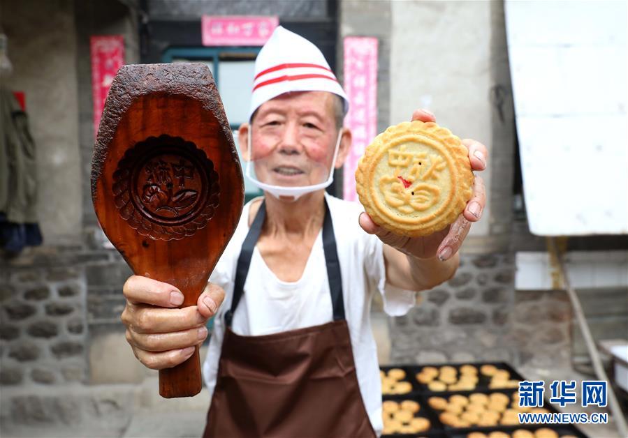9月12日,石家庄市井陉县天长镇的“端盛长”传统手工月饼制作工坊的经营者、72岁的于银柱在展示手工刻制的模具和烘烤好的月饼。 随着中秋佳节的临近,位于河北省石家庄市井陉县天长镇的“端盛长”传统手工月饼制作工坊开始忙碌起来,工作人员开足马力制作月饼。据了解,井陉县天长镇“端盛长”传统手工月饼制作工坊起源于清代,距今已有百余年历史。“端盛长”传统手工月饼以五仁和豆沙馅为主,从和面、做馅、擀皮一直到包制、印模、烘烤,每一道工序均为手工制作完成。 新华社发(梁子栋 摄)