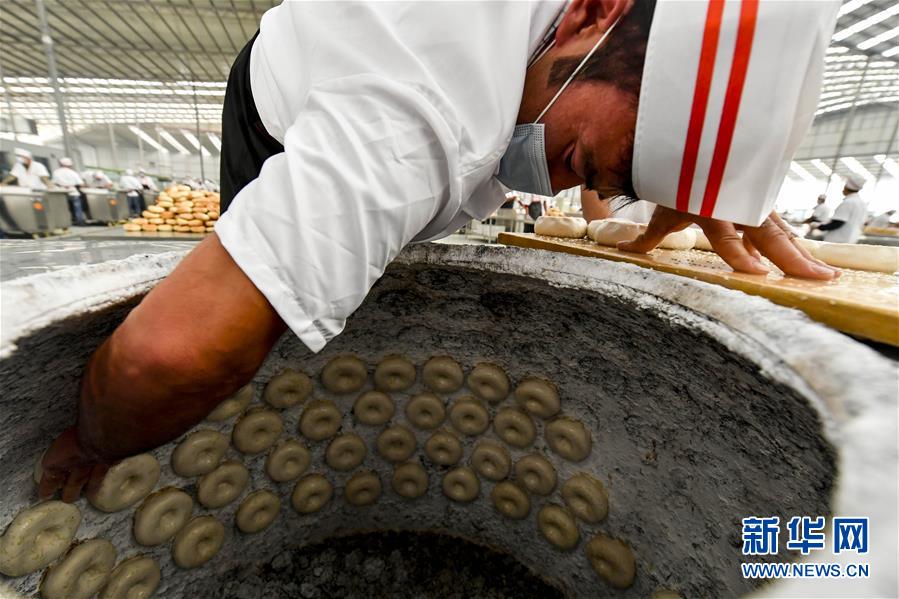 9月12日,在伽师县馕文化产业园的生产车间里,一名工人在制作烤馕。 新华社记者 马锴 摄