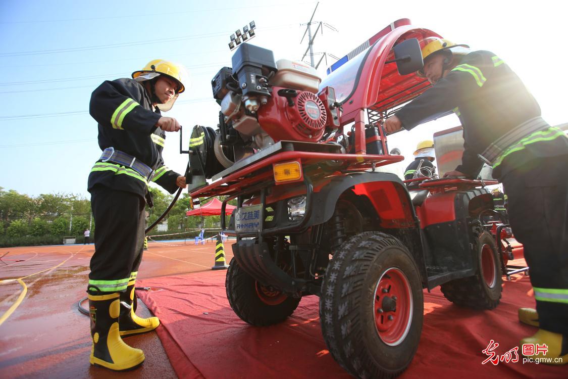 2020年9月15日,福建省厦门市同安区在梧侣文体活动中心举办村居微型消防站比武竞赛,提升微型消防站队员灭火救援应急处置水平。图为村居微型消防站队员进行"手抬泵吸水出水操"项目比拼。(曾德猛摄/光明图片)