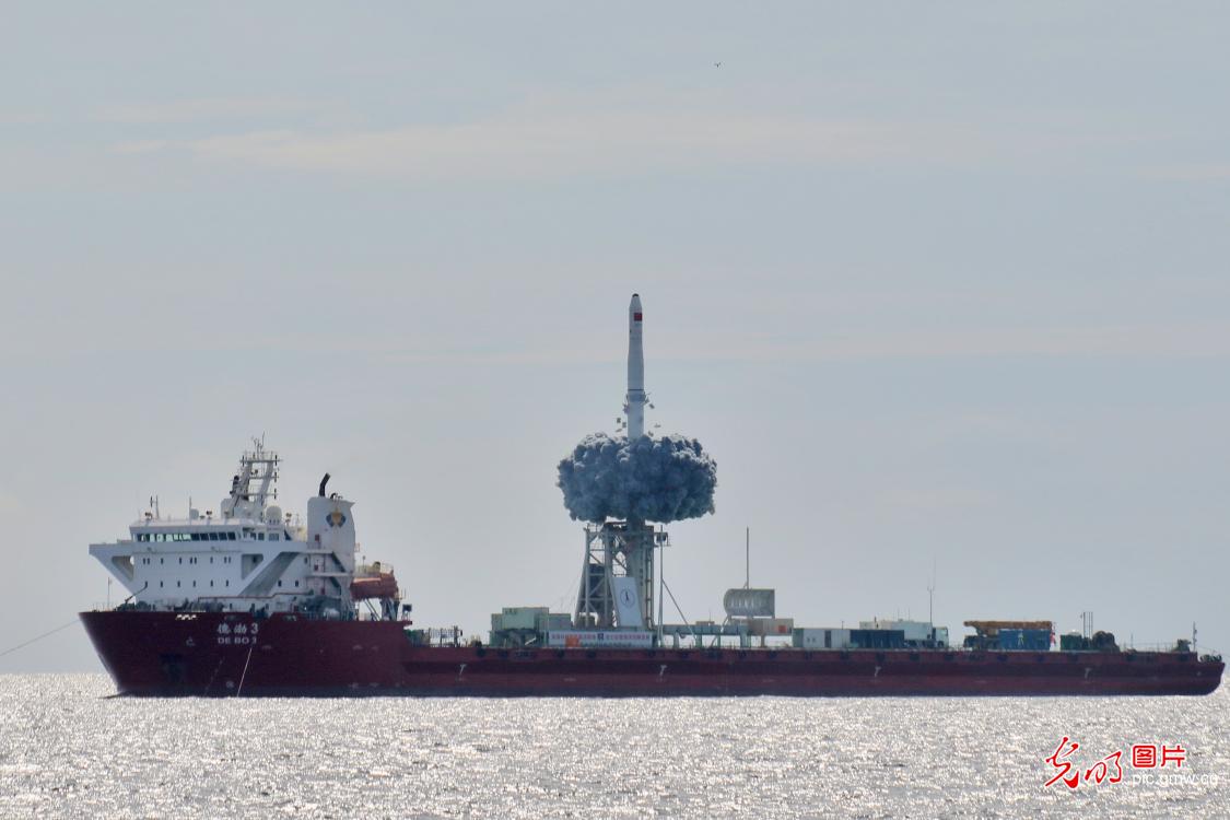 2020年9月15日,长征十一号运载火箭在黄海海域采用"一箭九星"的方式,成功将吉林一号高分03系列9颗卫星送入535公里的太阳同步轨道。卫星入轨后主要用于获取高分辨率遥感图像和视频,可为我国国土资源监测、智慧城市建设、林业资源普查等领域提供遥感数据服务。(唐克摄/光明图片)