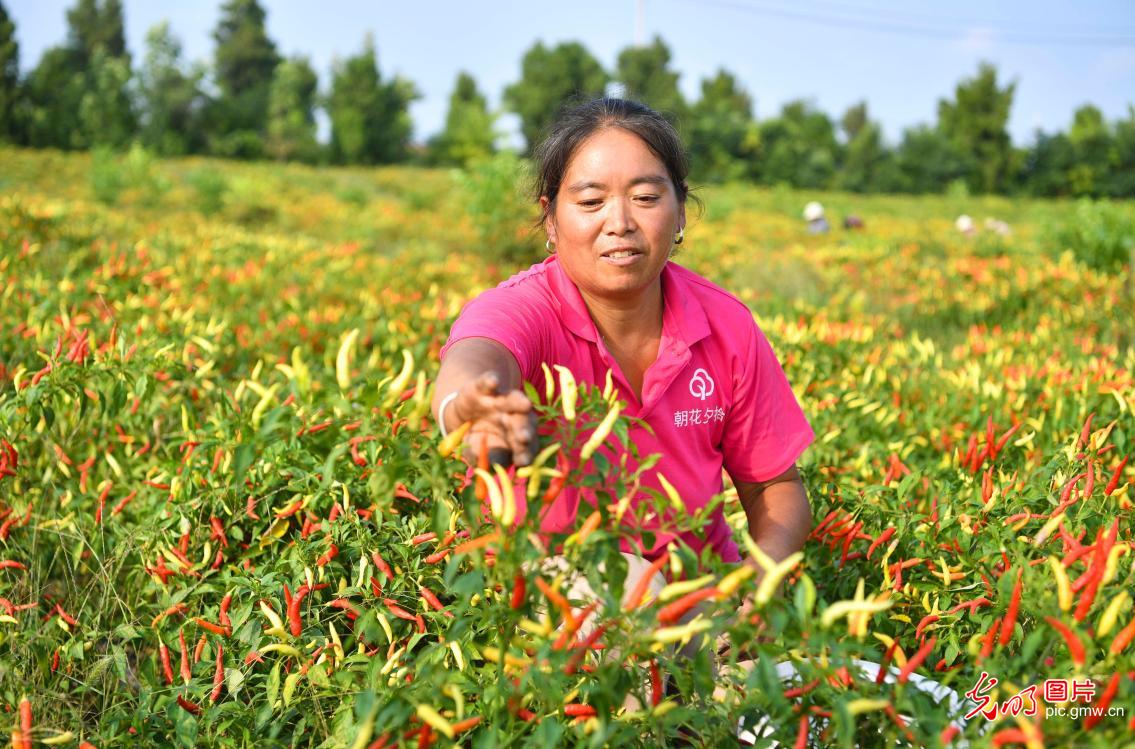 金秋时节,安徽省亳州市谯城区刘芷农机专业合作社种植的100多亩辣椒丰收上市,农民们忙着采摘、晾晒,烘干、供应市场等工作,田间呈现出一派丰收的喜人景象。(刘勤利摄/光明图片)