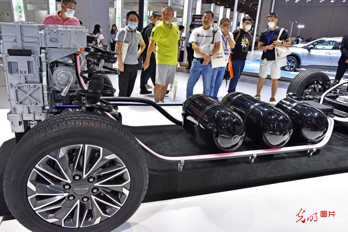 2020年9月15日,第22届中国国际工业博览会上展商展示氢燃料电池汽车动力集成系统。