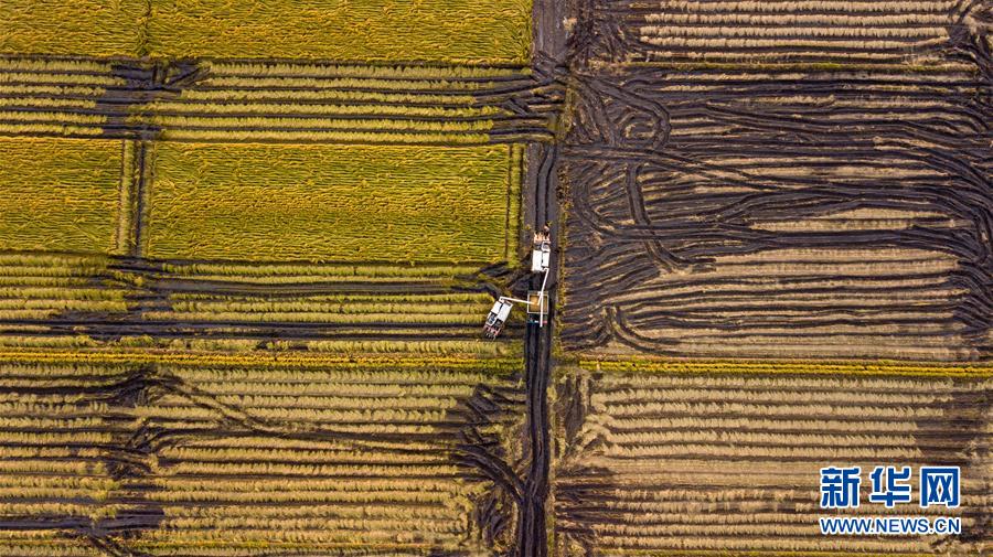 9月16日,在吉林省吉林市永吉县万昌镇张全家庭农场,农民将收获的水稻转运到运粮机上(无人机照片)。 金秋九月,吉林省各水稻主产区陆续进入收获季,农民抓紧收割水稻,田间呈现喜人的秋收图景。 新华社记者 张楠 摄