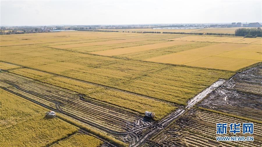 9月16日,在吉林省吉林市永吉县万昌镇张全家庭农场,农民驾驶农机收割水稻(无人机照片)。 金秋九月,吉林省各水稻主产区陆续进入收获季,农民抓紧收割水稻,田间呈现喜人的秋收图景。 新华社记者 张楠 摄