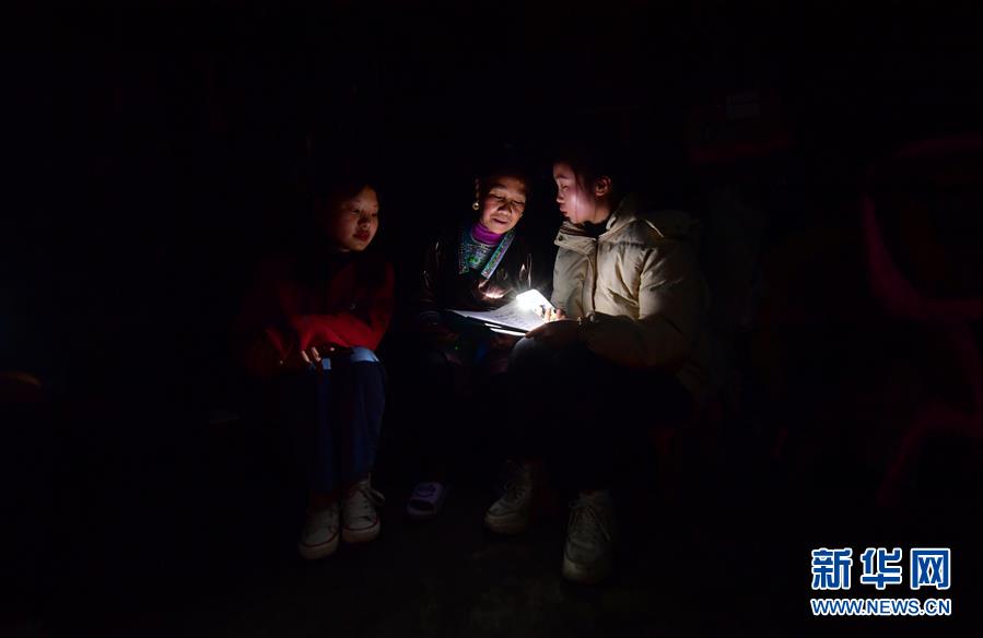 在乌英苗寨,大学生梁孟香(右一)教67岁的梁英迷讲普通话(4月2日摄)。 新华社记者 黄孝邦 摄