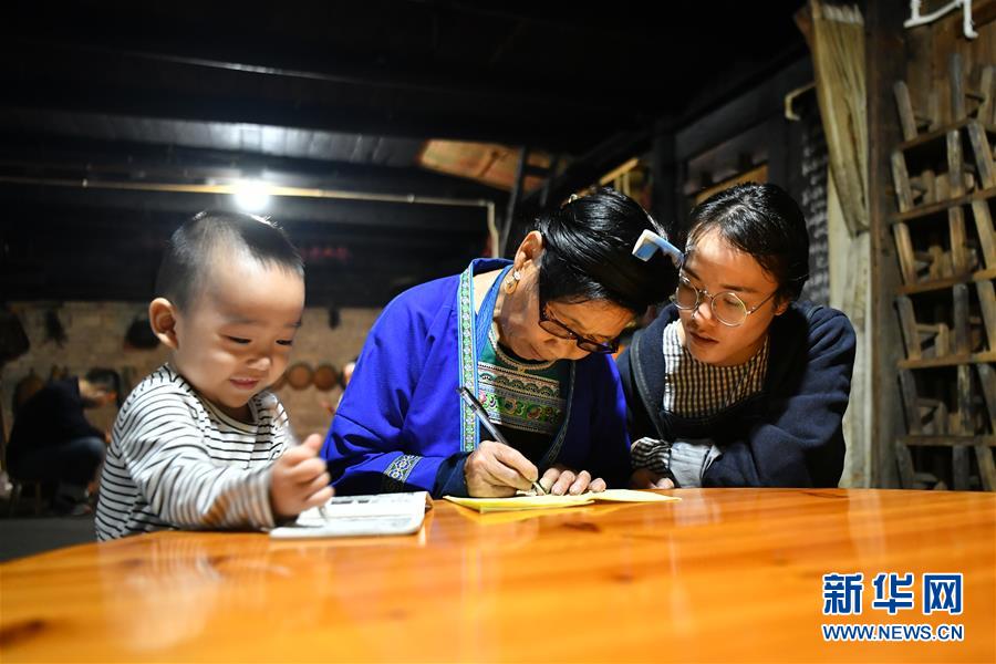 在乌英苗寨,送教老师吴小舒(右)辅导67岁的梁英迷写作业(9月11日摄)。 新华社记者 李鑫 摄