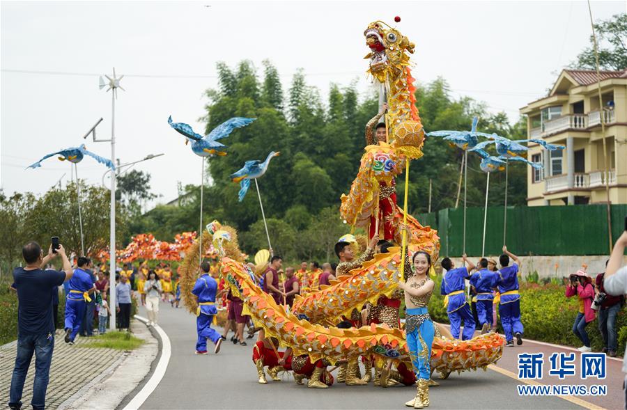 9月19日,铜梁区乡村振兴西郊示范片的西郊绿道上,当地村民在进行传统舞龙表演。 为迎接中国农民丰收节的到来,9月19日,在素有龙乡之称的重庆市铜梁区,当地乡村振兴西郊示范片各个村庄的姑娘、小伙们舞起了大儒龙、板凳龙、稻草龙、小彩龙,用当地传统习俗舞龙来共同庆祝丰收之喜,祝愿乡村振兴让农村越变越好。 新华社记者 刘潺 摄