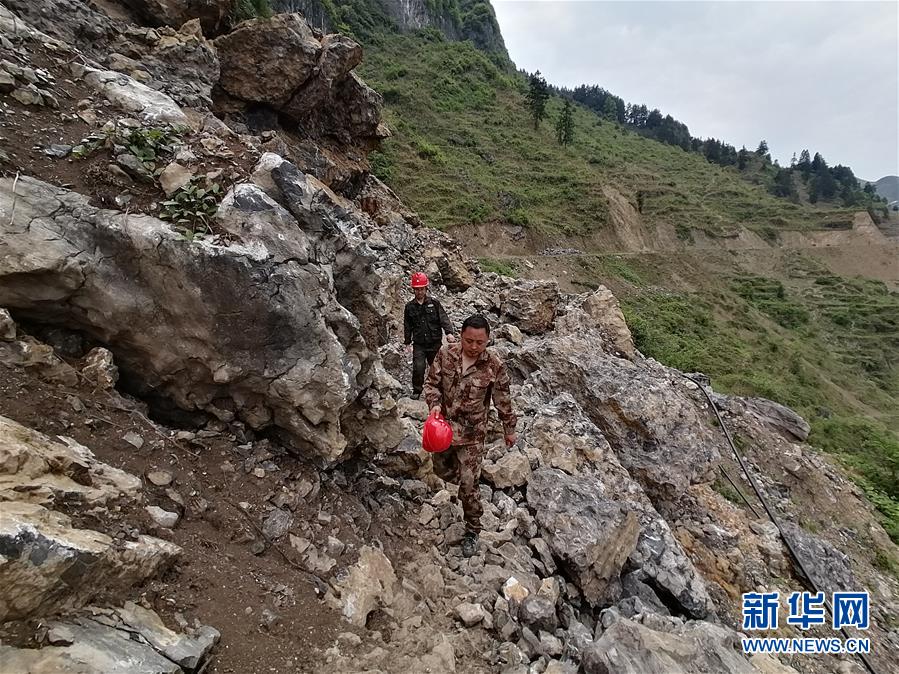 贵州省沿河土家族自治县思渠镇边疆村的扶贫干部晏飞(前)和钱鑫步行查看水源点(4月29日摄)。 新华社发(崔伟 摄)