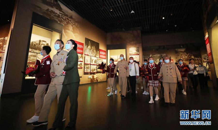 9月19日,志愿军老战士在少先队员和讲解员的陪同下参观抗美援朝纪念馆。新华社记者 杨青 摄