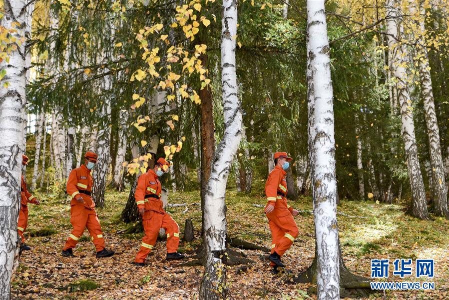 9月19日,在位于新疆喀纳斯景区内的禾木村,消防队员开展清山巡护。
