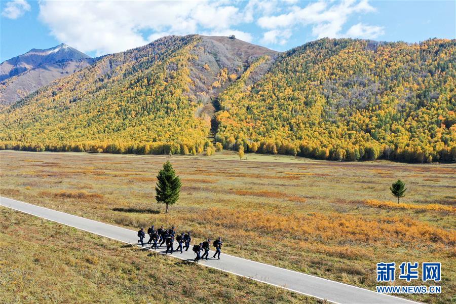 9月19日,在位于新疆喀纳斯景区内的禾木村,消防队员进行负重越野训练(无人机照片)。新华社记者 丁磊 摄