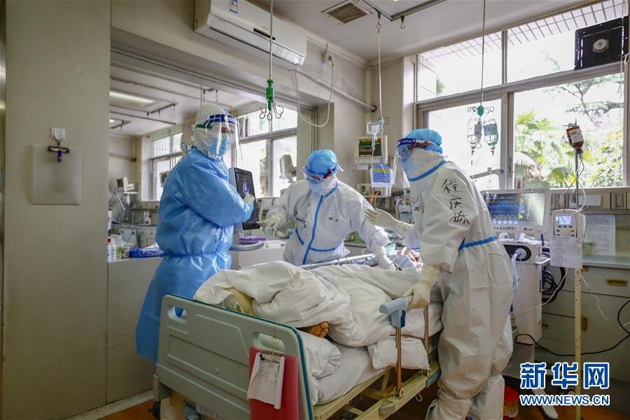 在中部战区总医院感染科重症病房内,医护人员为患者做床旁超声检查(3月16日摄)。新华社发(王皓宇 摄)