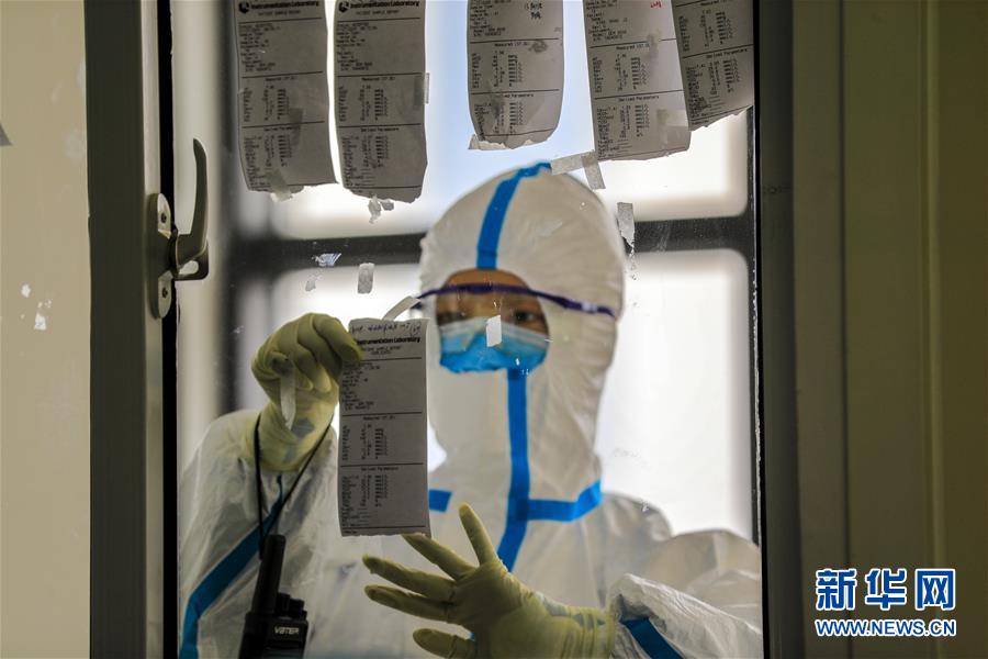 中部战区总医院支援武汉市肺科医院医疗队护士在玻璃窗上粘贴床旁检验数据,供医生参考检查结果(1月27日摄)。新华社发(王皓宇 摄)