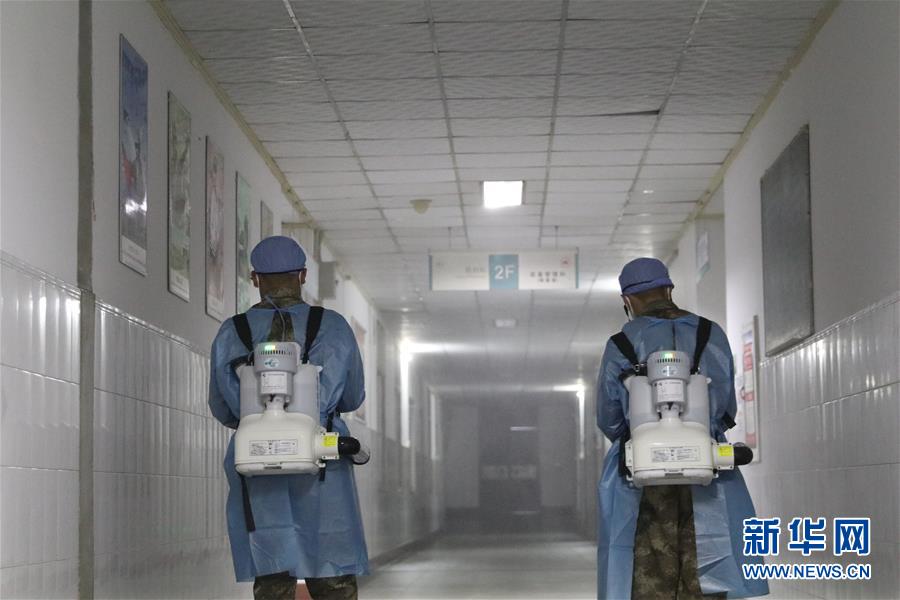 中部战区总医院环境消杀分队队员对新改造的收治新冠肺炎患者的病房进行消杀(1月26日摄)。新华社发(王震 摄)