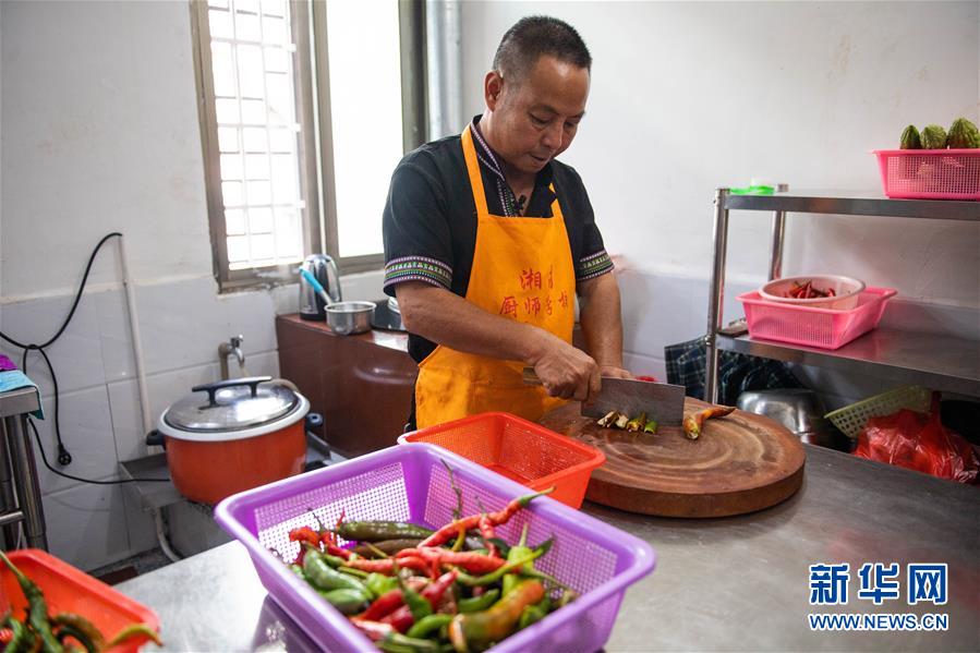 9月17日,在汝城县文明瑶族乡沙洲瑶族村,朱小红在自家开的农家乐厨房里切菜。新华社记者 陈思汗 摄