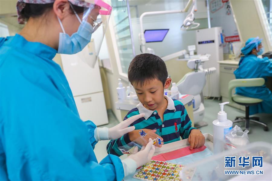 9月18日,儿童口腔医护人员为一名刚刚完成治疗的小患者贴上用于鼓励的小贴纸。