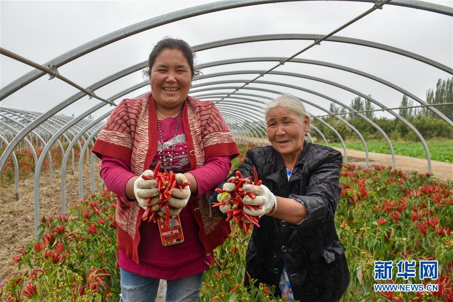 9月19日,在新疆英吉沙县芒辛镇拱棚蔬菜种植基地,农民展示采摘的辣椒。 秋收时节,新疆喀什地区英吉沙县芒辛镇拱棚蔬菜种植基地内的辣椒迎来丰收,农民抢抓农时进行采摘。据介绍,今年英吉沙县种植特色经济高辣辣椒面积达6000多亩,全部为加工企业订单种植,产量预计可达2000多吨。 新华社记者 高晗 摄