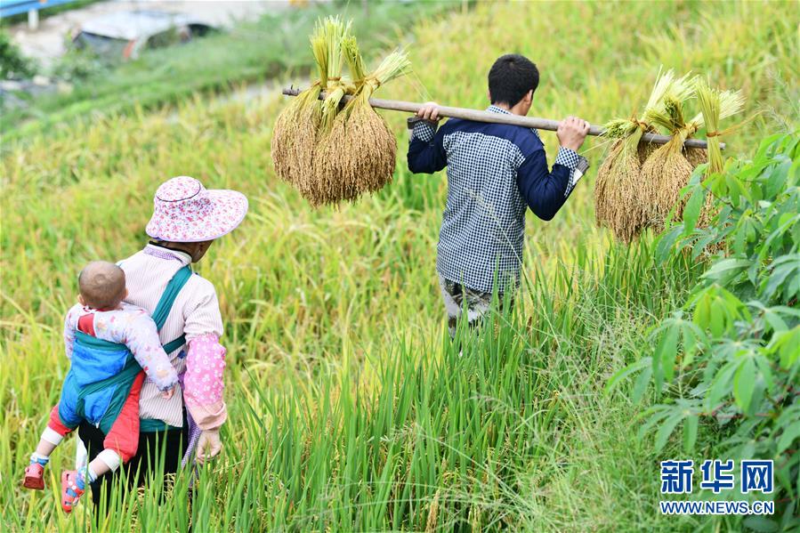9月19日,从江县加榜乡加车村的农民在搬运稻谷。 近日,位于月亮山区的贵州省从江县加榜梯田种植的水稻迎来收获季节,当地农民抓住秋雨停歇时机收割、搬运、晾晒稻谷。 新华社记者 杨文斌 摄