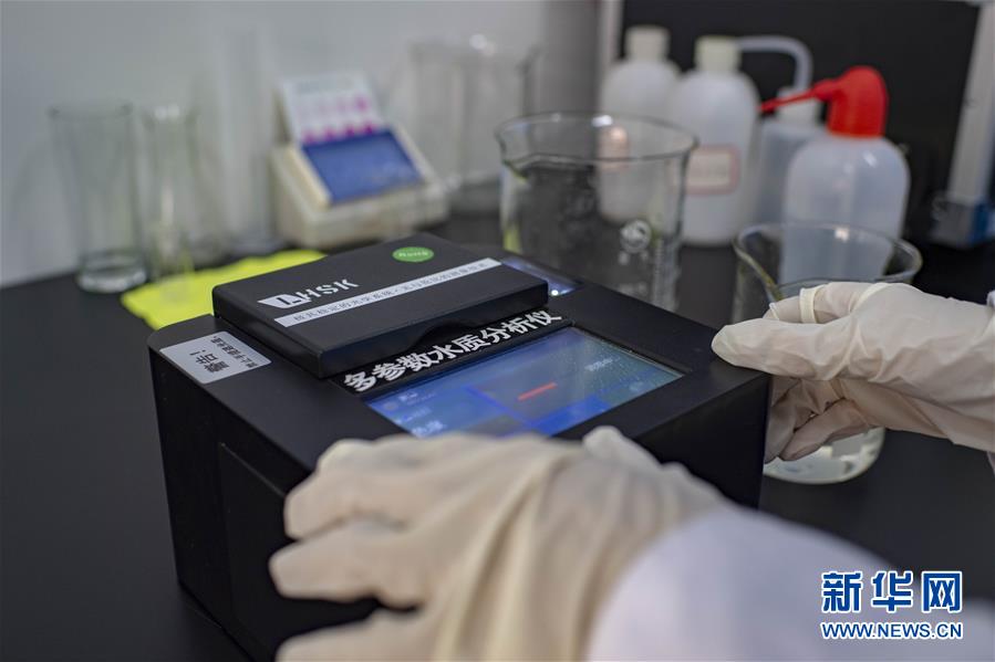 9月20日,新疆策勒县供水总厂工作人员在实验室工作。 新疆策勒县南依昆仑山脉,北靠塔克拉玛干沙漠。长期以来,当地面临着水资源短缺和时空分布不均等难题。在脱贫攻坚进程中,策勒县持续推进改水惠民工程,保障城乡居民饮水安全。 策勒县供水总厂工程总投入3亿多元,于2019年9月正式通水,覆盖策勒县城区、四个乡镇及易地搬迁区的生活用水,日供水能力约3.5万立方米。 新华社记者 胡虎虎 摄