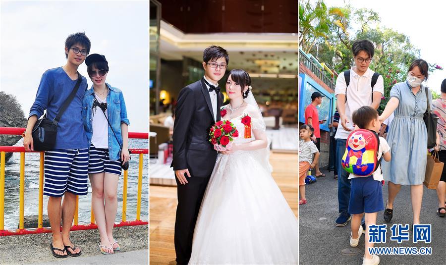拼板照片:左图为陈信彦、杨嘉林2013年在台湾旅行时的合影(资料照片);中图为两人2015年在厦门举行婚礼时的合影(资料照片);右图为2020年9月18日夫妻二人在厦门幼儿园接儿子回家(新华社记者姜克红摄)。 新华社发