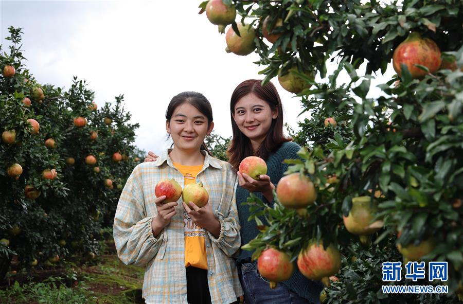 9月19日,在会理县彰冠镇富乐村一片石榴果林中,何爽(右)和妹妹何倩展示成熟的石榴。