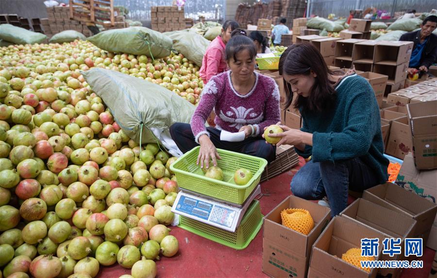 9月19日,何爽(右)在物流仓库里和工人一起查看石榴果形并称重,以便进一步分拣。 新华社记者 江宏景 摄
