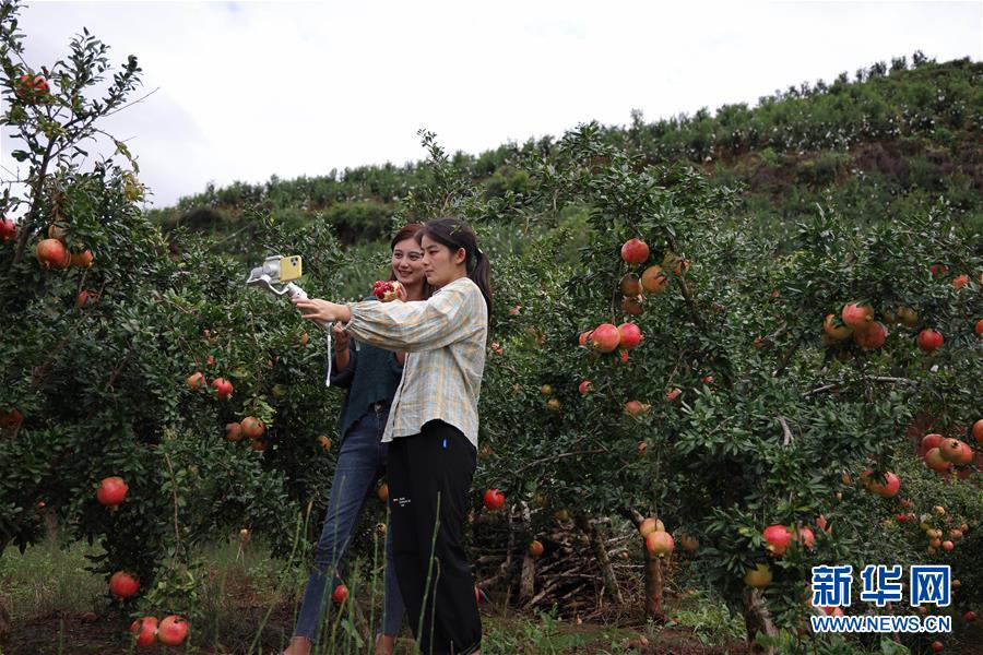 9月19日,在会理县彰冠镇富乐村,何爽(左)和妹妹何倩在一片石榴林中进行新媒体平台直播。 新华社记者 江宏景 摄