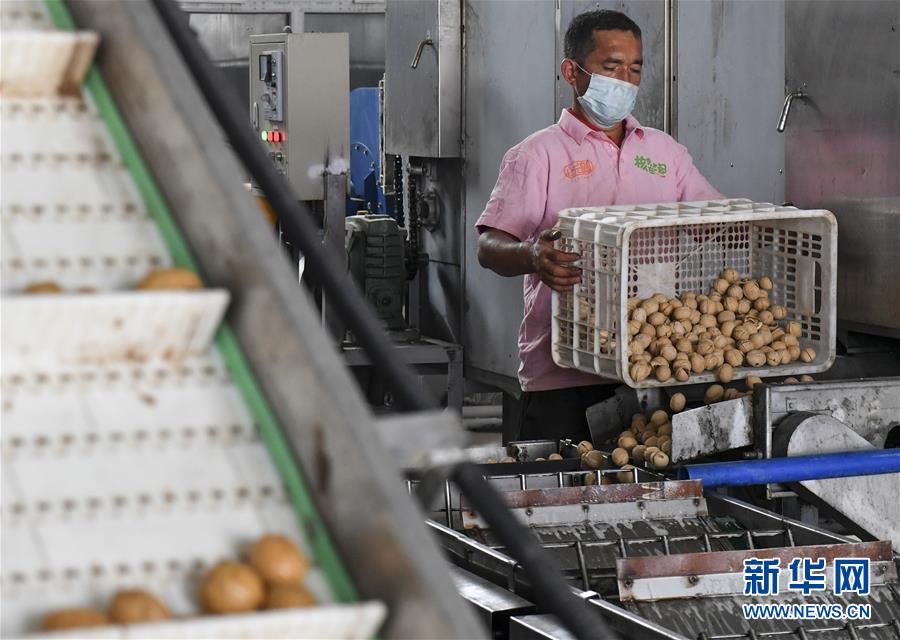 9月19日,在叶城县新疆美嘉食品饮料有限公司的车间内,一名工作人员将清洗后的核桃倒入生产线。 金秋时节,新疆喀什地区叶城县的核桃进入采收季。据叶城县农业农村局介绍,截至2020年该县核桃种植总面积达58万亩,预计产量达13万吨。 叶城县是新疆未摘帽国家级贫困县之一。近年来,在当地政府的大力推动下,核桃产业已成为当地居民脱贫增收的重要渠道。 新华社记者 马锴 摄