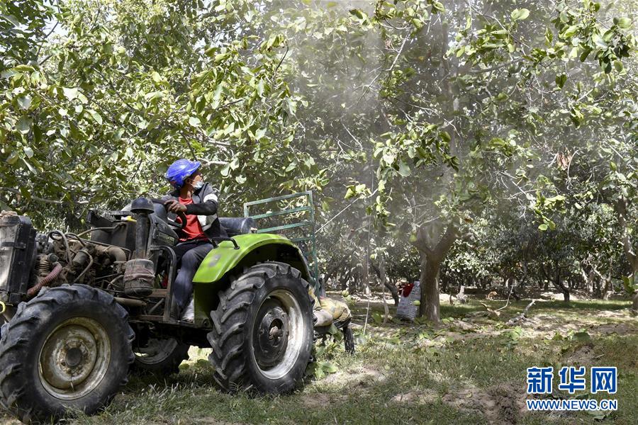 9月19日,在叶城县铁提乡的一处核桃园内,农户使用机械将树上的核桃摇下。 金秋时节,新疆喀什地区叶城县的核桃进入采收季。据叶城县农业农村局介绍,截至2020年该县核桃种植总面积达58万亩,预计产量达13万吨。 叶城县是新疆未摘帽国家级贫困县之一。近年来,在当地政府的大力推动下,核桃产业已成为当地居民脱贫增收的重要渠道。 新华社记者 马锴 摄