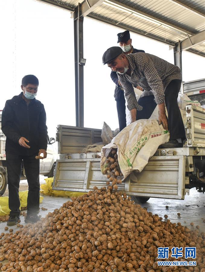 9月20日,在新疆果业集团叶城县核桃交易中心,农户向客商展示自己的核桃。 金秋时节,新疆喀什地区叶城县的核桃进入采收季。据叶城县农业农村局介绍,截至2020年该县核桃种植总面积达58万亩,预计产量达13万吨。 叶城县是新疆未摘帽国家级贫困县之一。近年来,在当地政府的大力推动下,核桃产业已成为当地居民脱贫增收的重要渠道。 新华社记者 马锴 摄