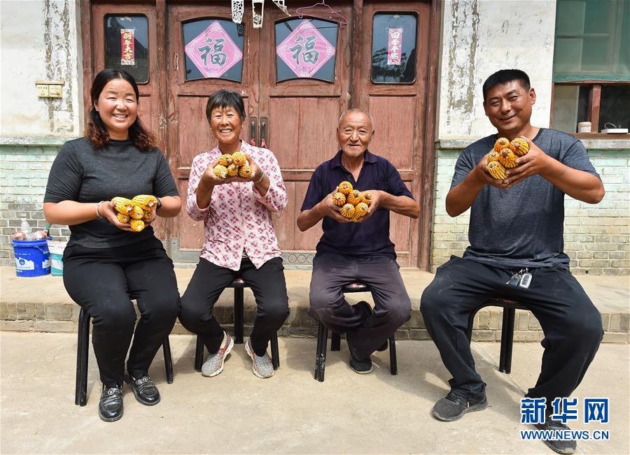 9月20日,在山西省运城市万荣县南张乡太赵村,李挺一家人展示收割好的玉米。