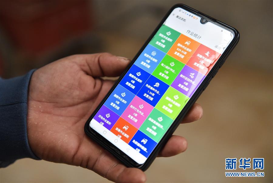9月20日,在山西省运城市万荣县南张乡太赵村,李挺展示手机上显示的农机GPS定位信息及作业统计。 新华社发 (柴婷 摄)