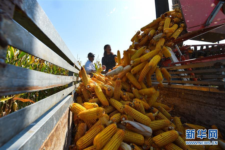9月20日,在山西省运城市万荣县南张乡太赵村,李挺的妻子李晓芬(右)在看收获的玉米。 新华社发 (柴婷 摄)