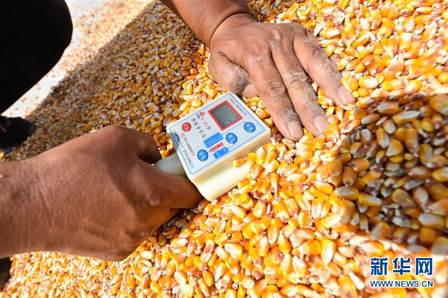 9月20日,在山西省运城市万荣县南张乡太赵村,李挺用仪器测量玉米的含水量。 新华社发 (柴婷 摄)