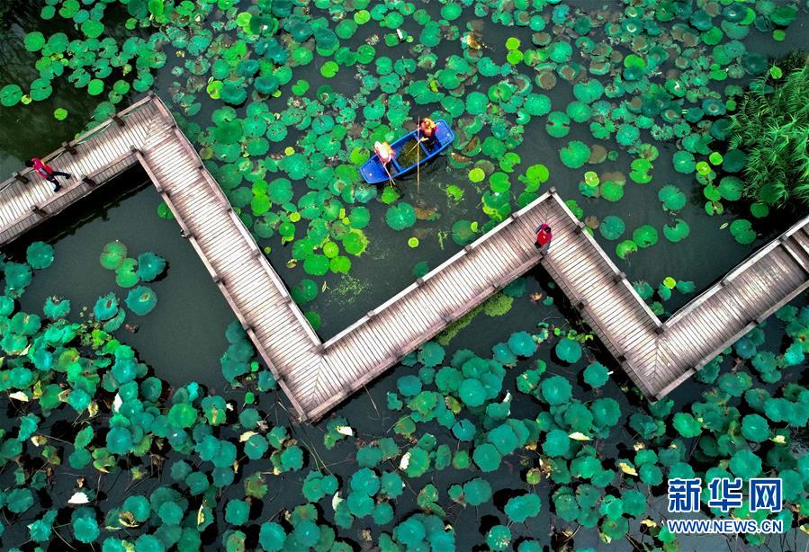 9月21日,长兴县吕山乡的基层党员志愿者在胥仓村池塘中打捞浮萍及水草(无人机照片)。 今年以来,浙江省湖州市长兴县吕山乡积极开展乡村河道保洁全覆盖活动,通过每月对辖区内河道进行巡查,定期安排志愿者进行护河活动,加大水环境治理力度,营造水清岸美的乡村环境。 新华社记者 徐昱 摄