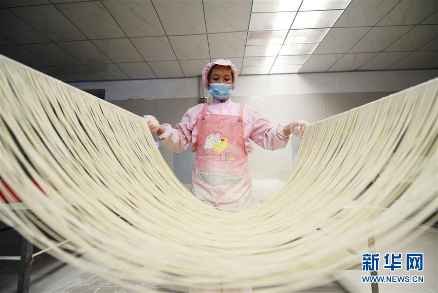 9月21日,河北省曲周县依庄乡军营村一手工挂面作坊的工人在制作挂面。 河北省邯郸市曲周县有着悠久的手工挂面加工历史。近年来,曲周县在推进产业富民的过程中,推广传统手工挂面加工工艺,通过开设手工挂面微作坊等方式,鼓励村民在家门口学艺、就业。 新华社记者 朱旭东 摄
