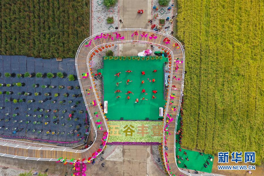 9月21日,村民在扎赉特旗第二届农民丰收节活动上表演扭秧歌(无人机照片)。 当日,内蒙古自治区兴安盟扎赉特旗在好力保镇五道河子村举办第二届农民丰收节活动。收割旱稻比赛、采摘万寿菊比赛等活动吸引村民参与其中。 新华社记者 徐钦 摄