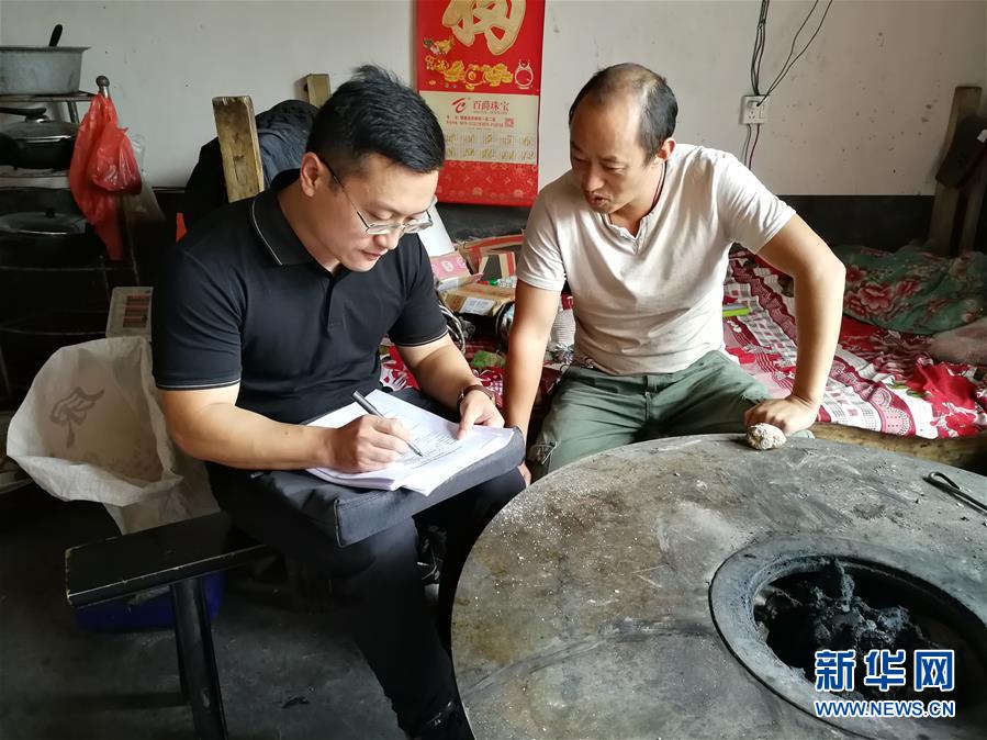 2019年9月11日,云南省昭通市镇雄县芒部镇松林村第一书记易志强(左)入户走访。 新华社发