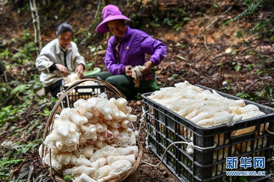 村民在贵州省榕江县寨蒿镇高赧村原始森林竹荪基地采摘竹荪(9月18日摄)。