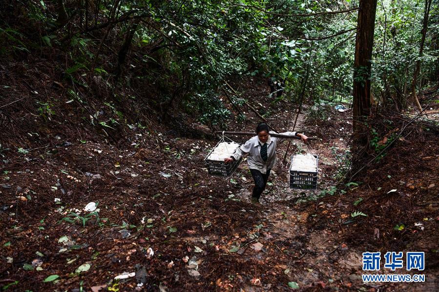 在贵州省榕江县寨蒿镇高赧村原始森林竹荪基地,村民在搬运刚采摘的竹荪(9月18日摄)。 新华社记者 杨文斌 摄