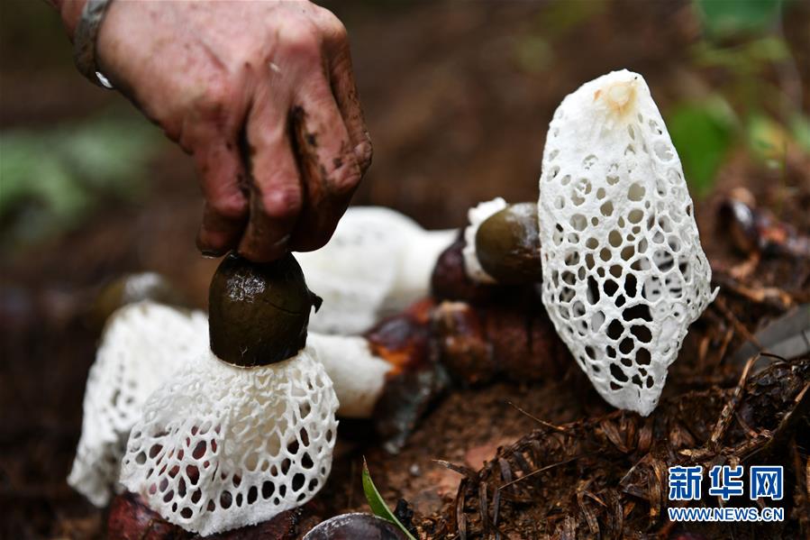 村民在贵州省榕江县寨蒿镇高赧村原始森林竹荪基地采摘竹荪(9月18日摄)。 新华社记者 杨文斌 摄