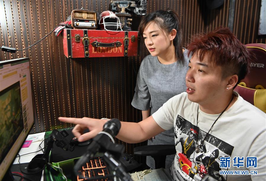 9月21日,朱慧宁(左)在公司与游戏主播交流直播技巧。 新华社记者 魏培全 摄